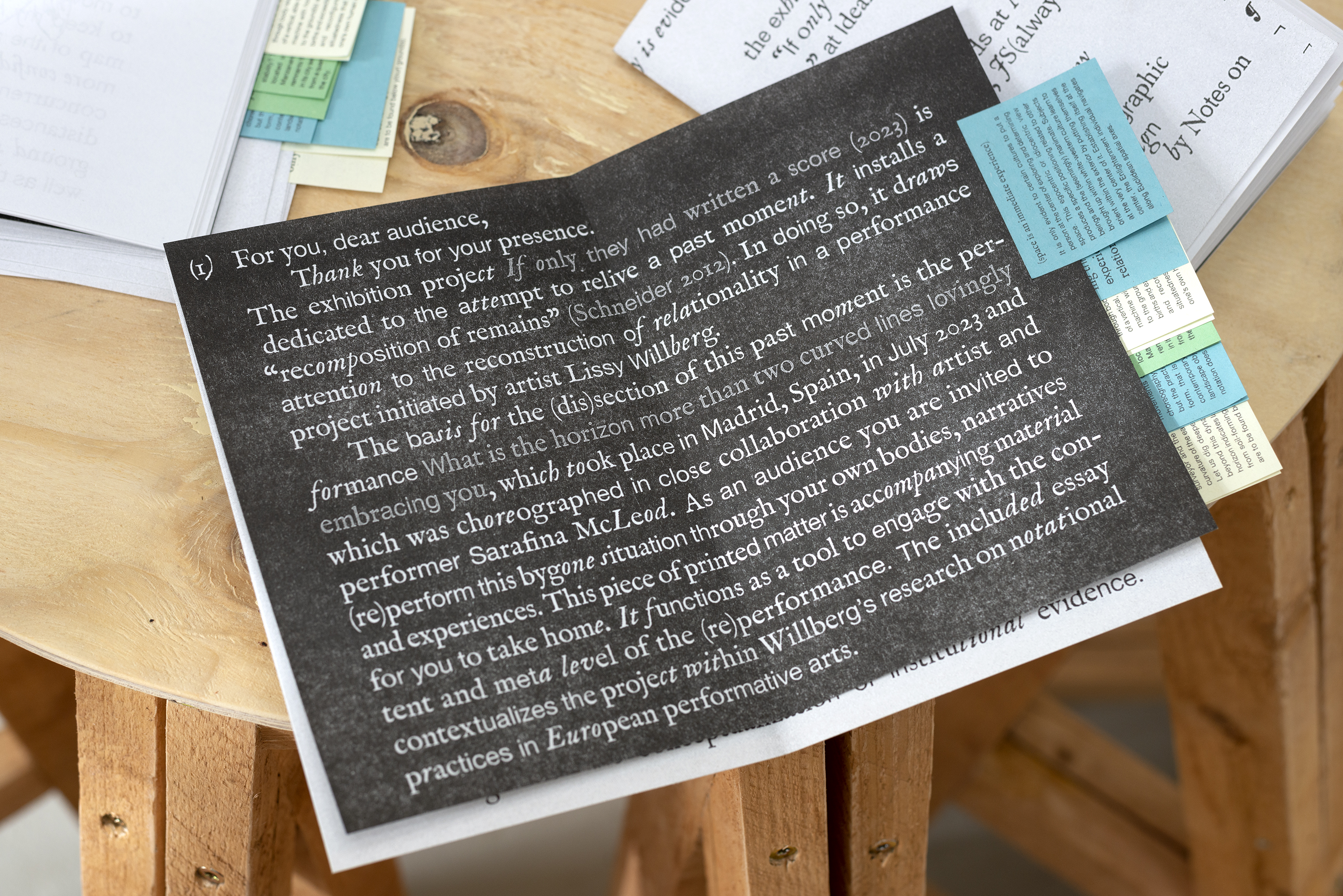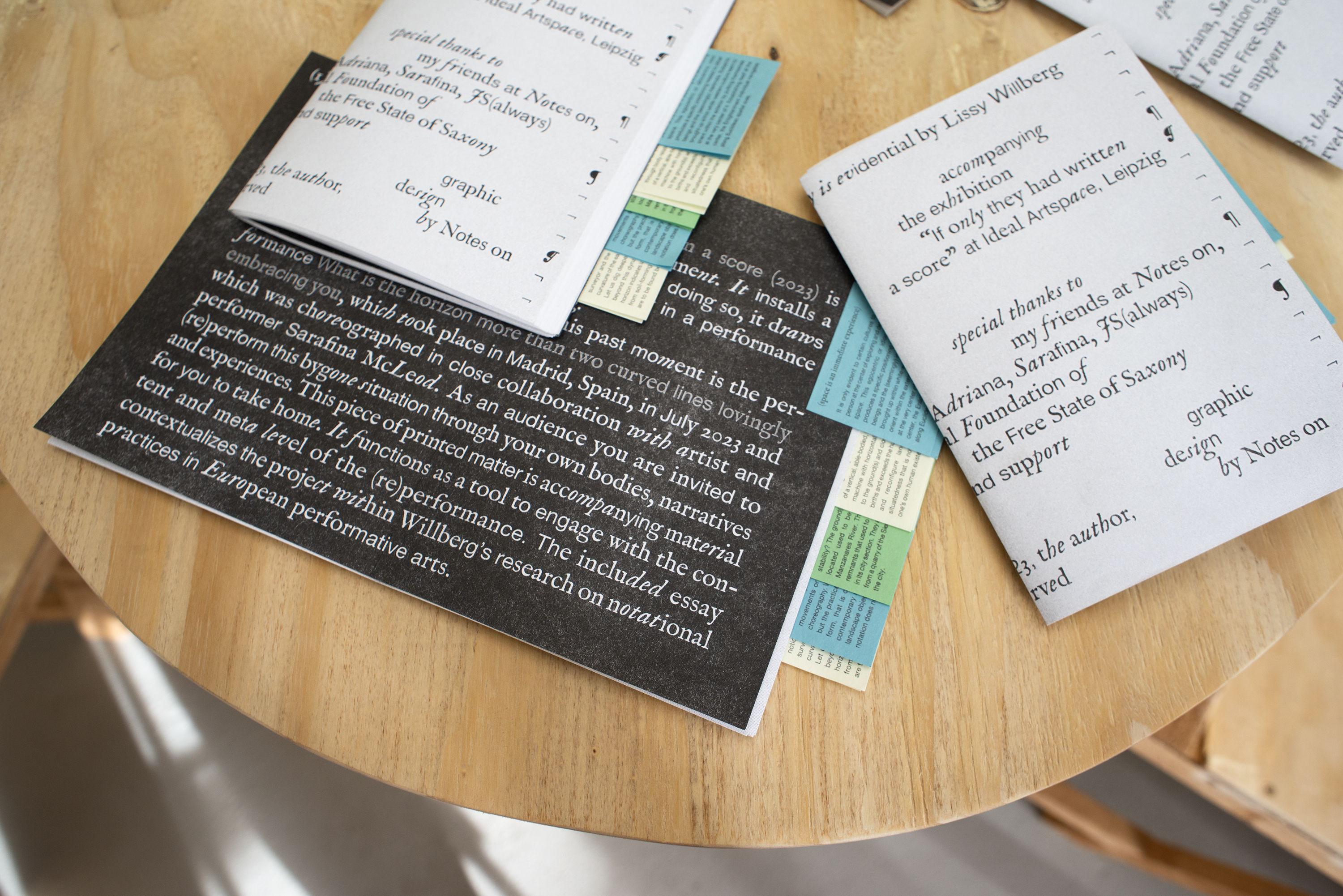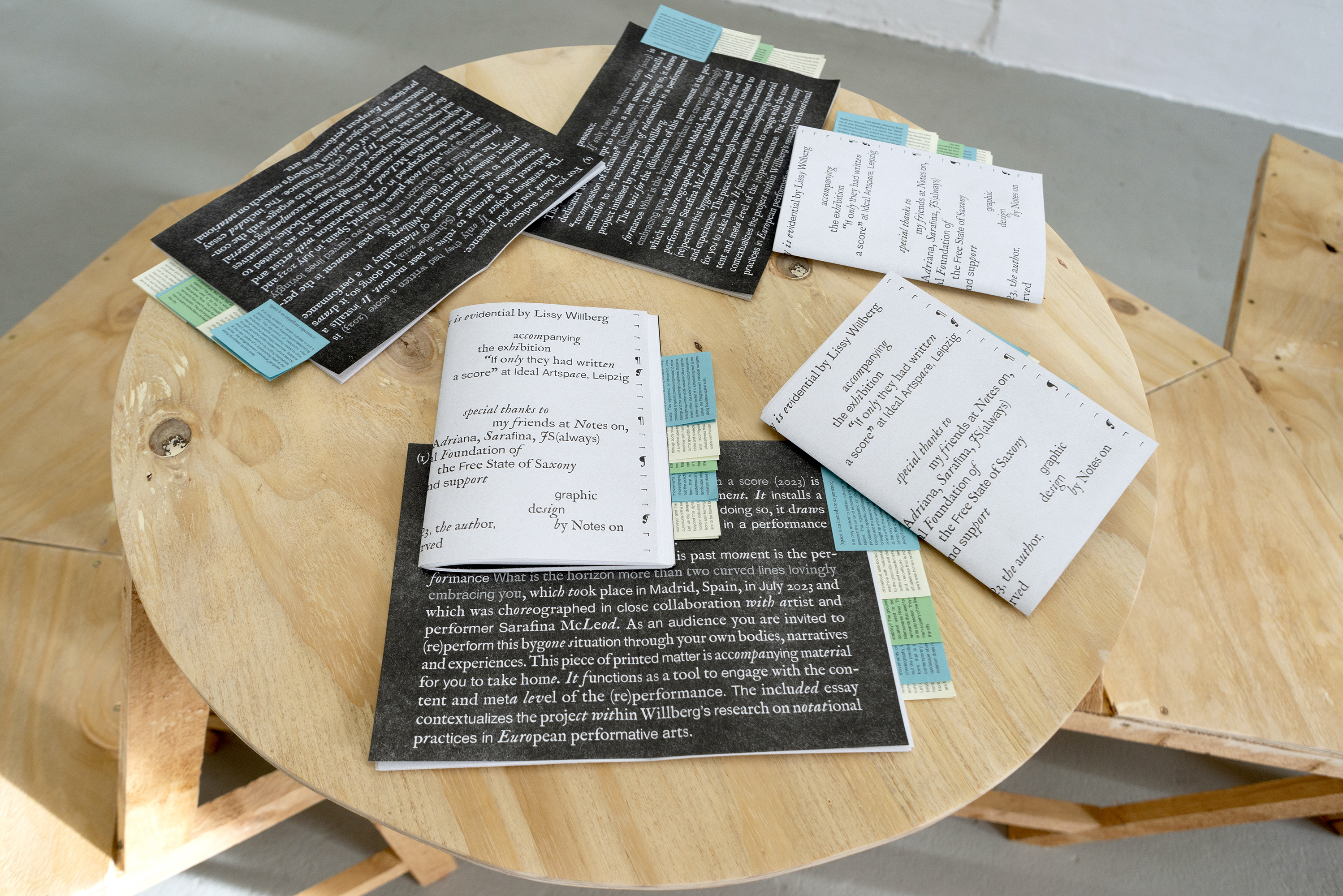 Design and conceptualization for the Essay Publication „Relationality is evidential“ by Lissy Willberg as part of the exhibition „If only they had written a score“ at IDEAL Artspace Leipzig. The design merges the essence of an open book with the tactile quality of a stack of rehearsal papers, the text runs through with a rather morphing typography. Little printed post-it notes—the same the artist is using in their working process—with scores of a previous performance are accompanying the publication.